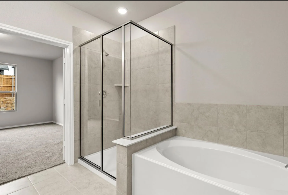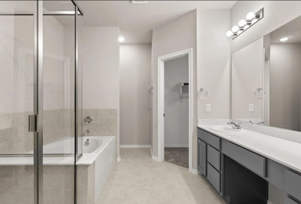 A luxurious primary suite with dual sinks, soaking tub & walk-in shower