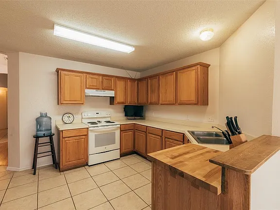 ๐งบ Kitchen features tons of cabinet space, an electric range, microwave & island with cutting-board top
