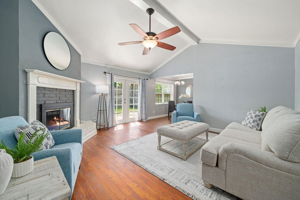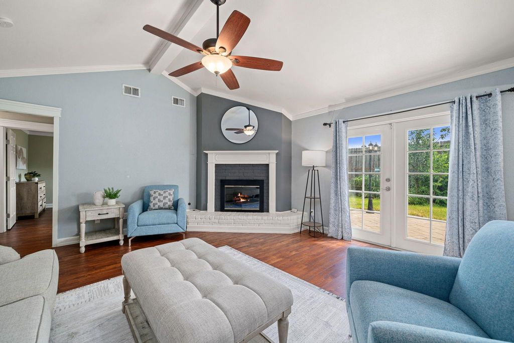The plan flows from a formal living and dining combo into a great room with beamed ceilings, a fireplace, and French doors to a private backyard with no rear neighbors. The all new kitchen offers custom cabinetry, stainless appliances, statement lighting, and a breakfast nook. The primary suite includes a spa style bath with a frameless glass shower, floating bowl vanity, and towel warmer. Two secondary bedrooms share an updated bath. Additional highlights: waterproof LVP flooring, full home re pipe, limestone patio, storage shed, new exterior outlets, extended driveway, and 2 car attached garage. Listing notes indicate a furnace update in Nov 2024 and per remarks the home has never flooded.