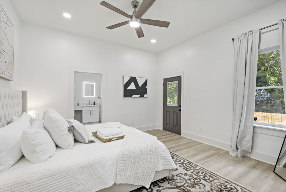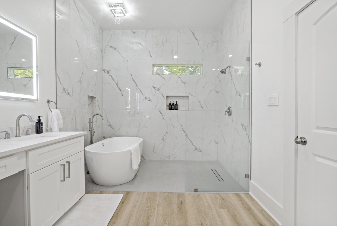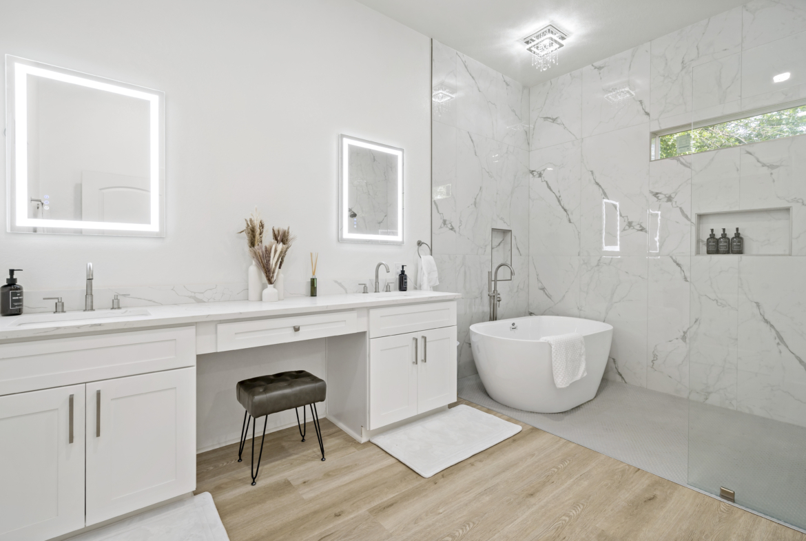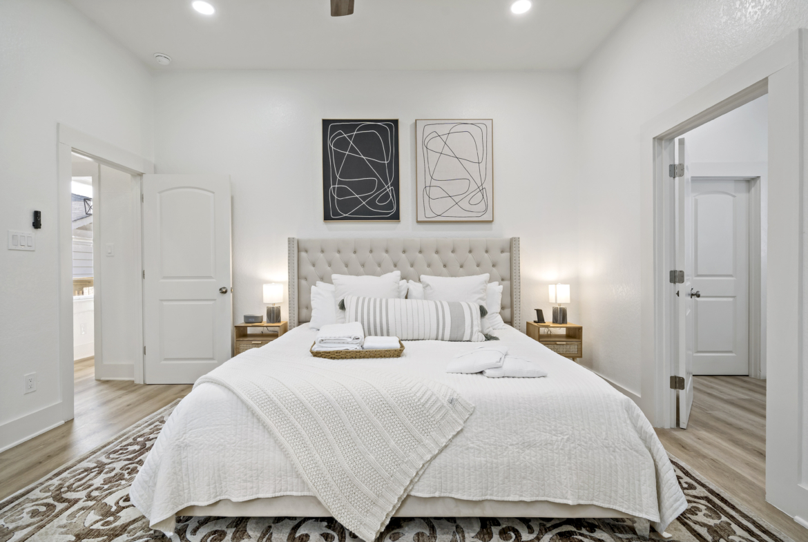 The primary suite includes a huge walk-in closet, private backyard access with downtown views, and a spa-like bathroom with a freestanding soaking tub, glass-enclosed walk-in shower, and double vanities 🛀✨