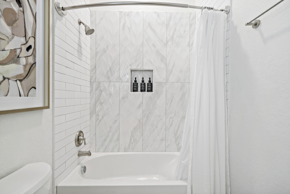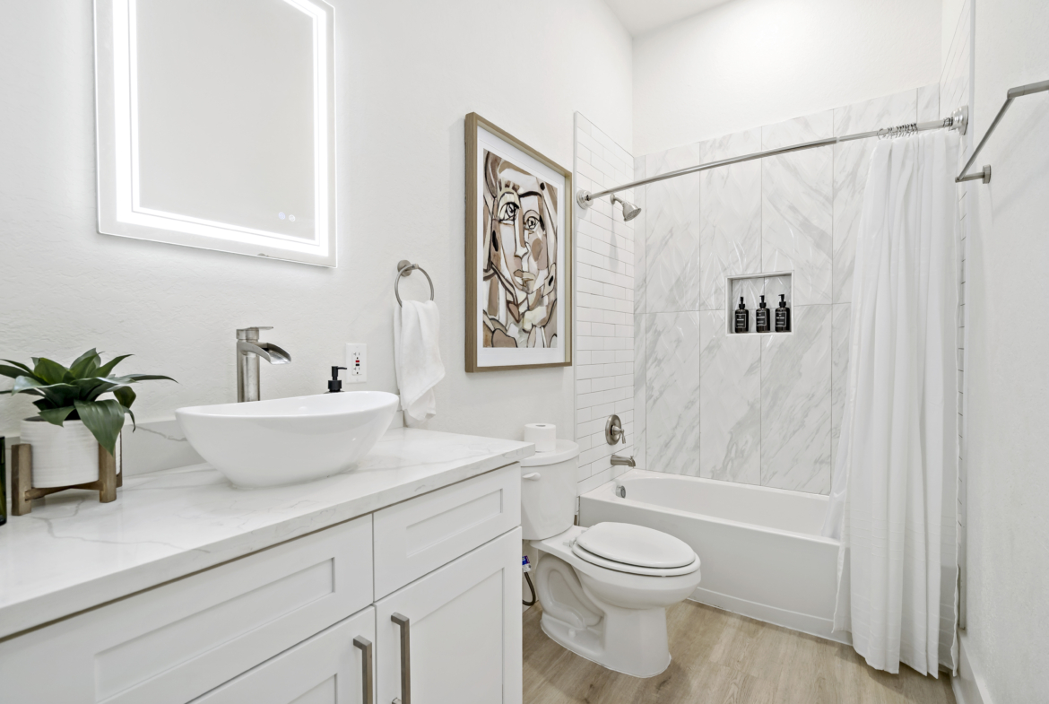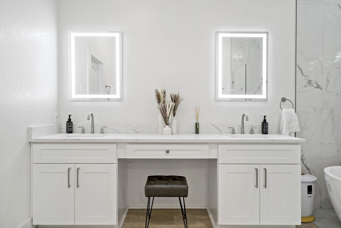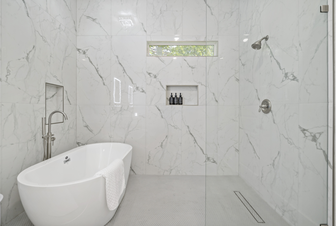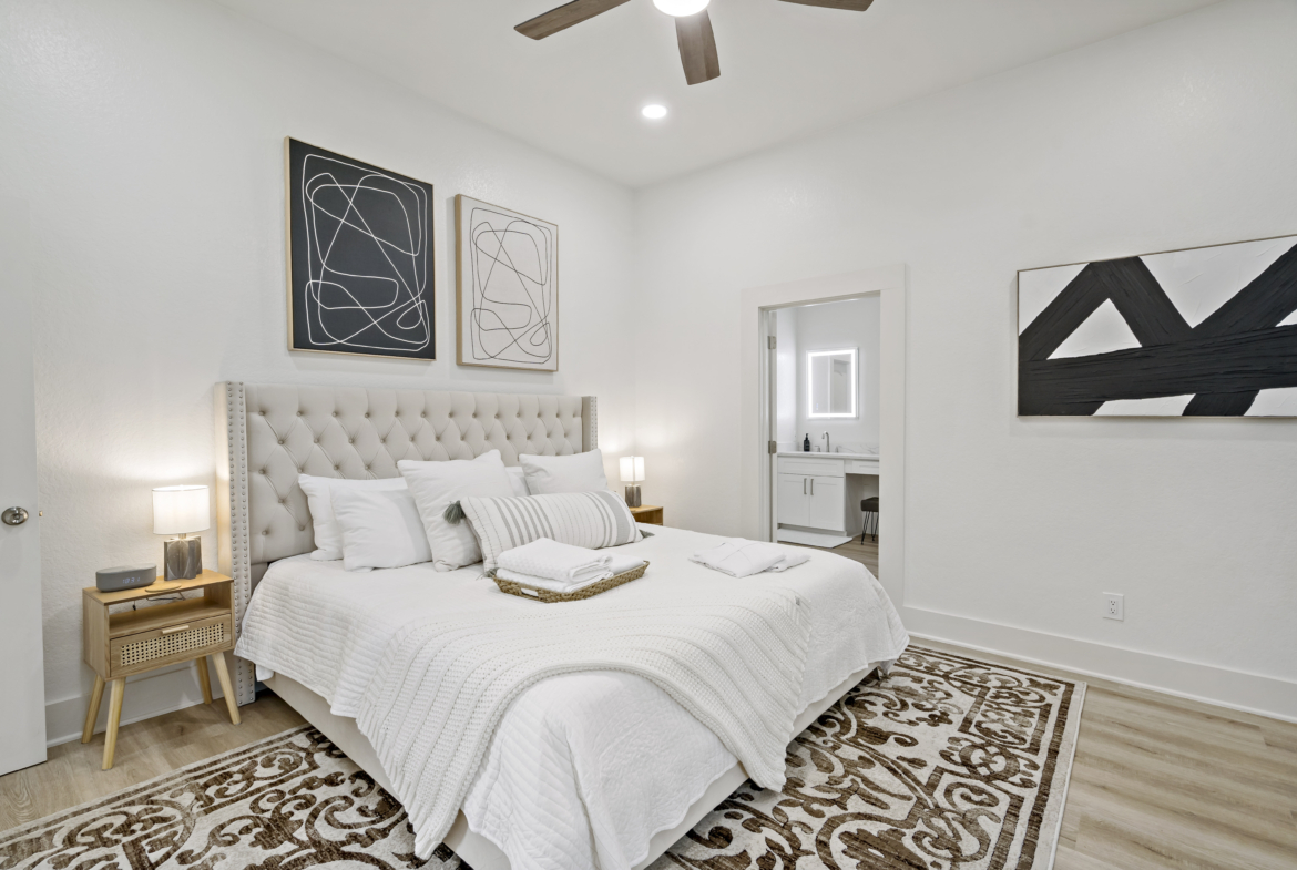The primary suite includes a huge walk-in closet, private backyard access with downtown views, and a spa-like bathroom with a freestanding soaking tub, glass-enclosed walk-in shower, and double vanities 🛀✨