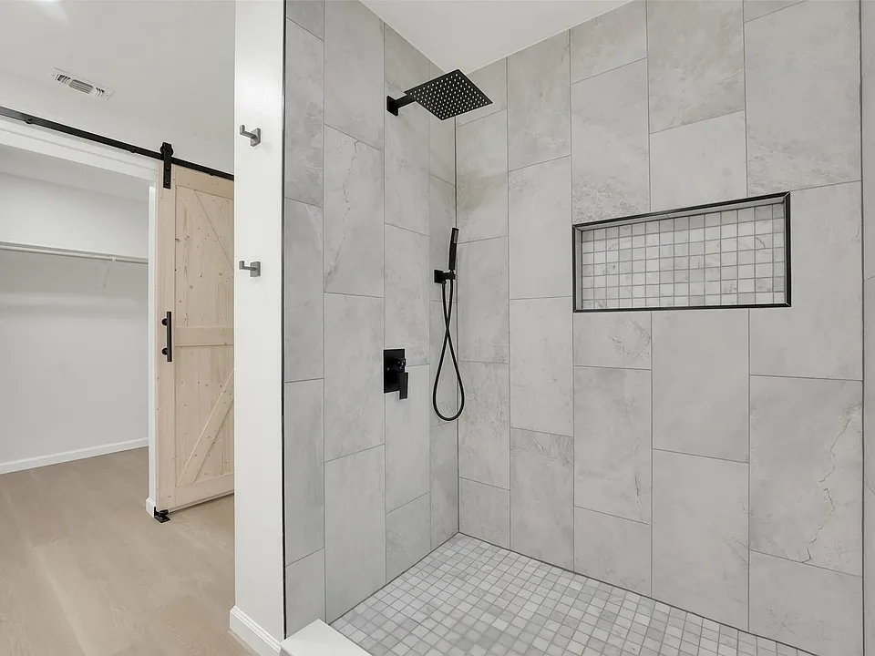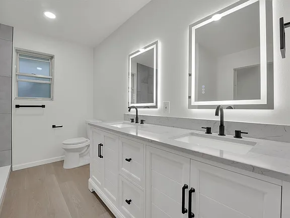 🚿 Fully remodeled primary bath featuring a high-end vanity, modern mirrors & a luxurious rain shower 🌧️✨