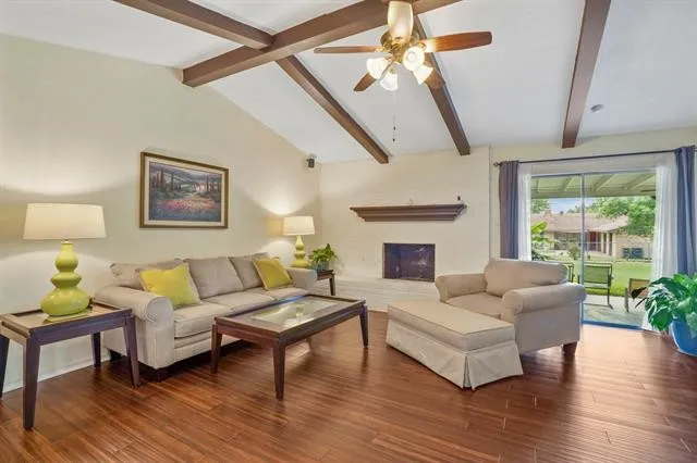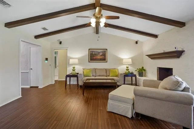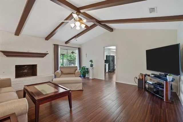 🔥 Spacious living room with a beautiful wood-burning fireplace
