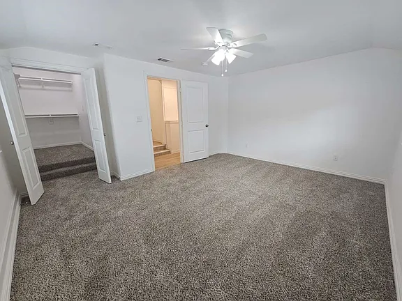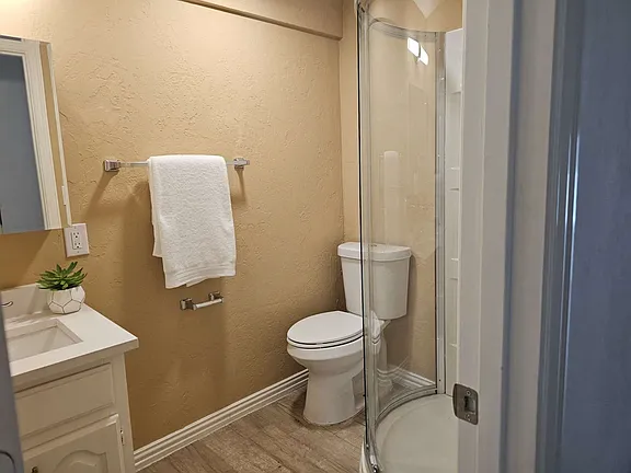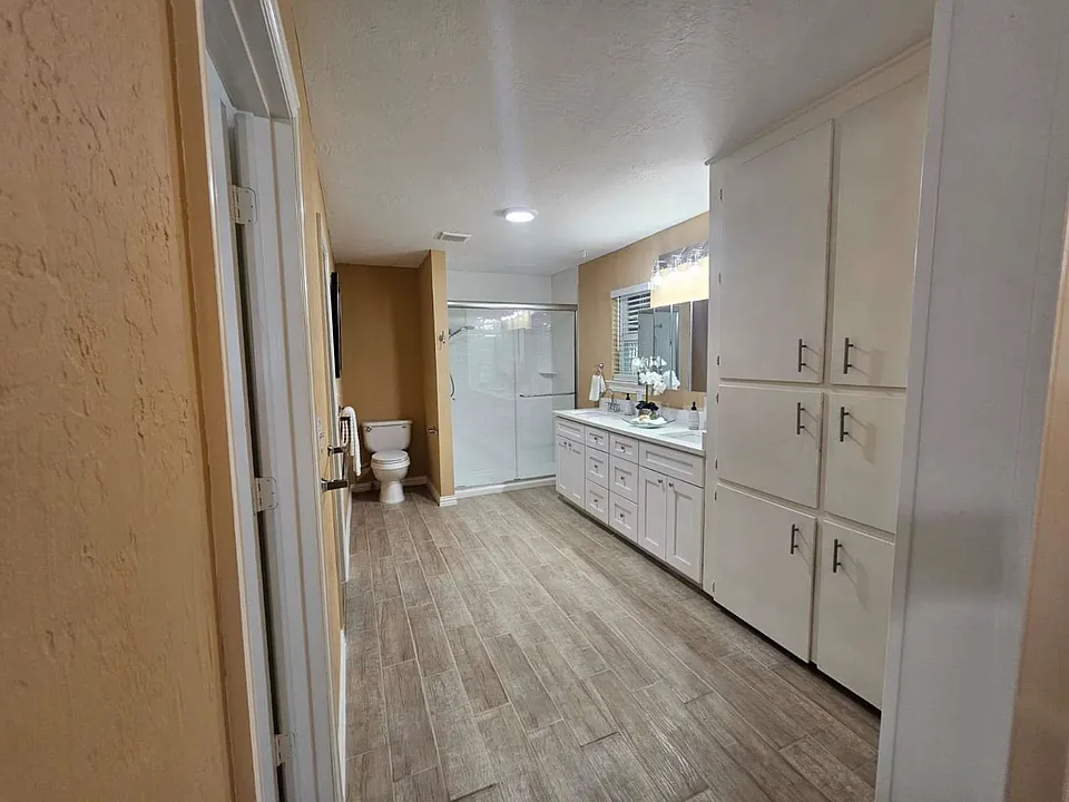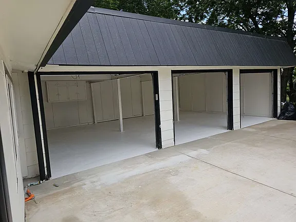 kitchen with quartz countertops, deep well sink, and brand new stainless steel appliances. The large master is downstairs with a large and open bathroom, and TWO large closets. Upstairs features another bedroom with it’s own full bath. Off the living area, you can step down into the very spacious 3 rd bedroom with an enormous walk in closet. The 3 car garage was built with STEEL BEAMS and has painted floors and LOTS of room for storage.