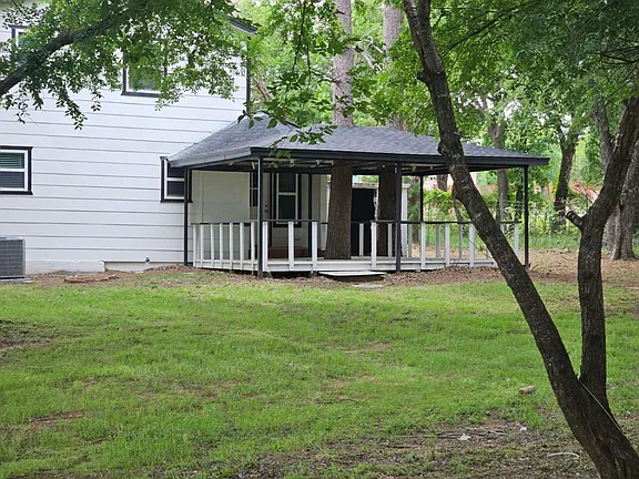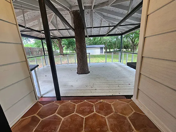 tree in the middle of the covered deck. You look out across your own slice of country heaven of almost .6 acres with a ranch behind you with horses. There is also a nice sized storage building in the back as well. Large, mature trees with plenty of room for a garden.