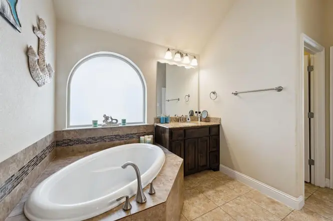 π The generous master suite features dual vanities, a garden tub, a separate shower, and a huge walk-in closet.
