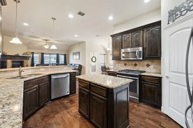 This home offers a spacious open floor plan featuring a large gourmet kitchen with a breakfast area, a cozy family room with a gas fireplace, and a flex space that can be used as a formal dining room or additional living area.