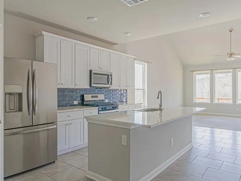 An airy open-concept layout showcases quartz countertops, a chic tile backsplash, and stainless steel appliancesincluding a gas stove, refrigerator, microwave, and dishwasher ๐ฝ๏ธ๐ฅ