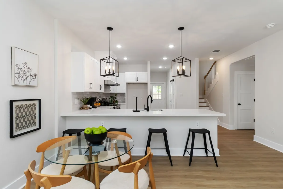 π Open and inviting floor plan that flows from the living area into the dining space and kitchen