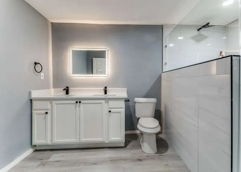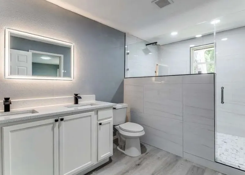 bathrooms have been elegantly redesigned with chic tile showers and lighted mirrors
