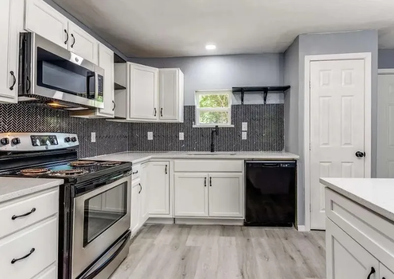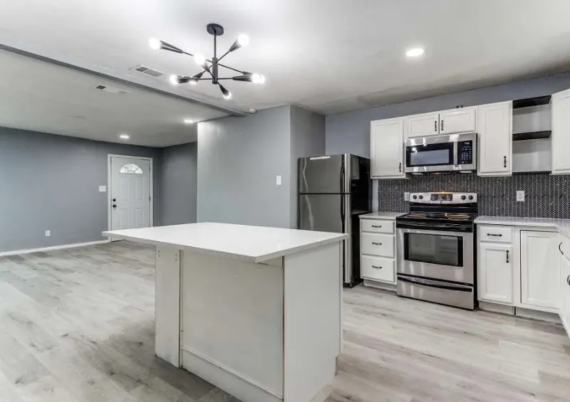 brand new quartz countertops, a spacious island perfect for meal prep or gatherings,
