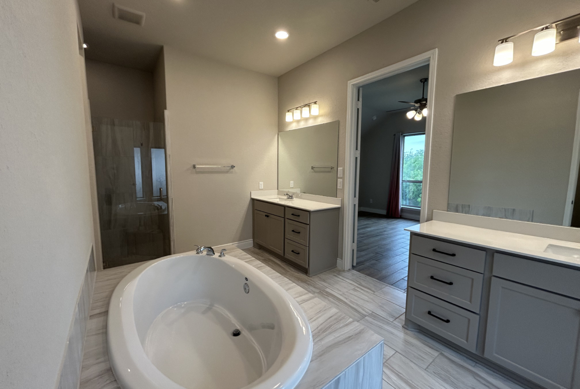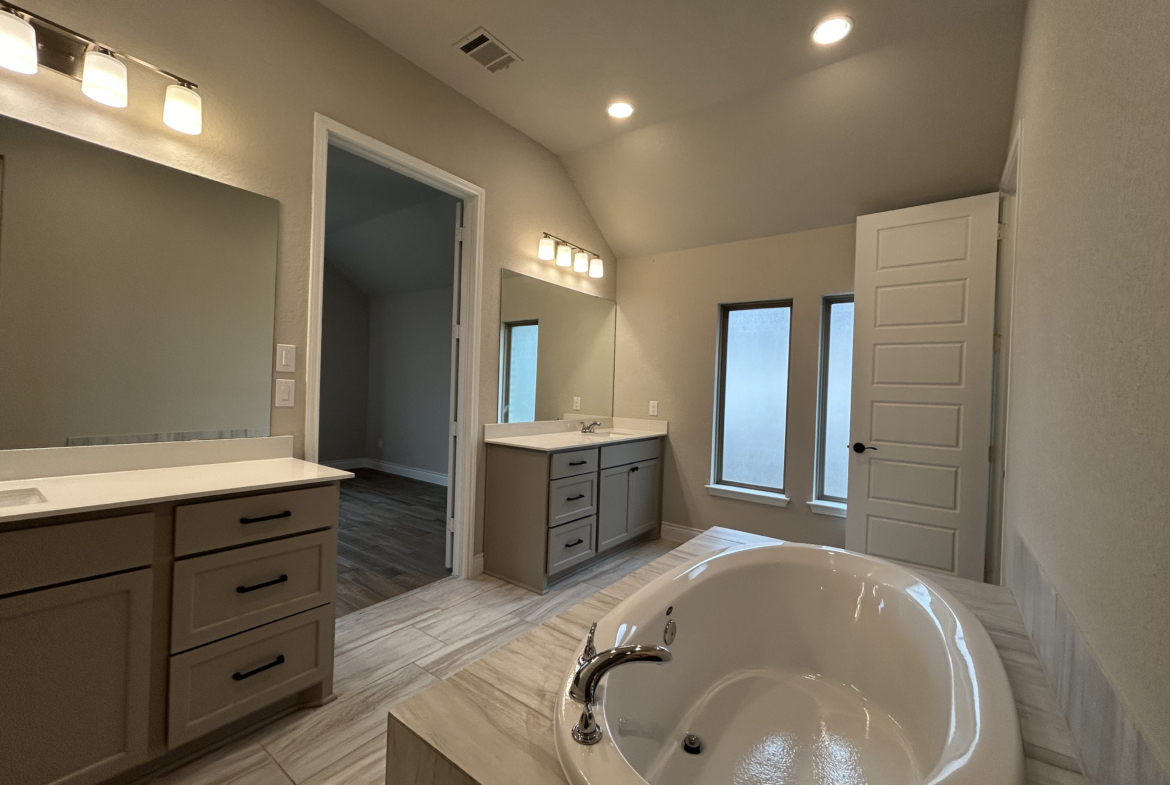 The primary suite is tucked away for privacy and includes dual vanities, a garden tub, a separate glass enclosed shower, and two walk in closets. A guest suite with its own full bathroom and walk in closet is perfect for visitors or extended family. Additional bedrooms and a utility room complete the home.
