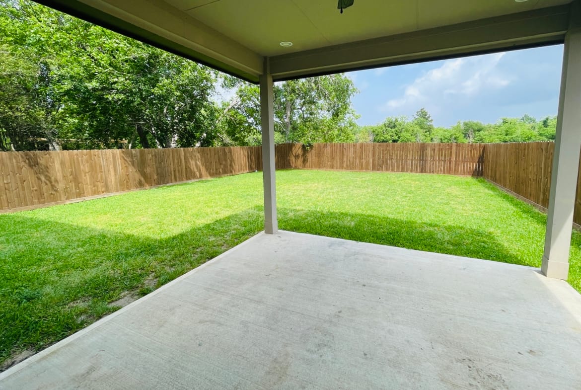 The big fenced backyard, complete with a covered patio area,