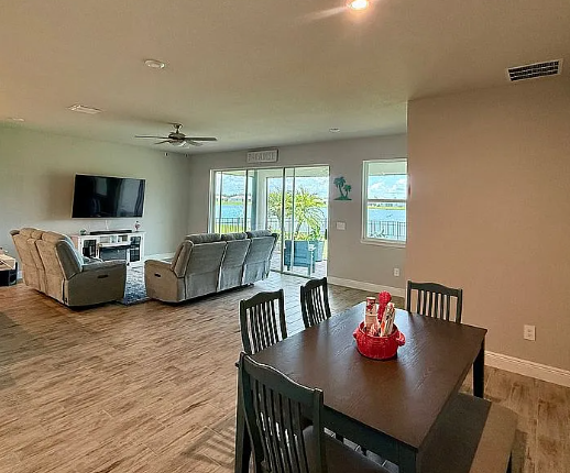 A wide-open floor plan connects the living room, dining area, and kitchen—ideal for entertaining or cozy nights in