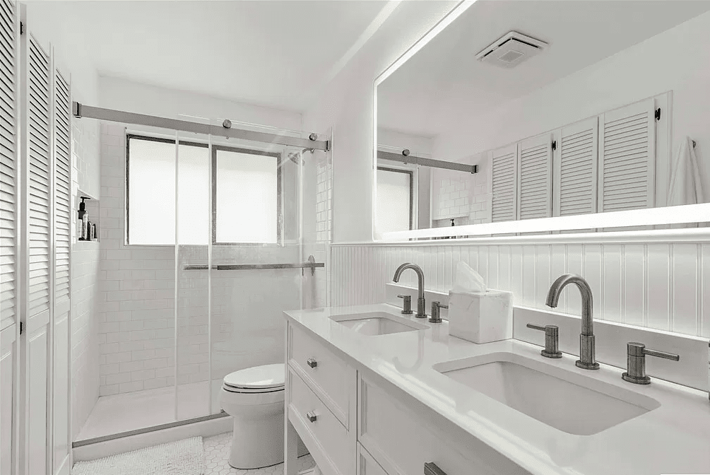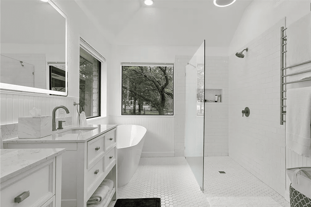 The home features a beautifully renovated interior, including new paint, vinyl flooring, and plush new carpet in the bedrooms. The marble bathroom counters and heated towel rail add a touch of luxury, while the soaking tub provides the perfect place to unwind after a long day.
